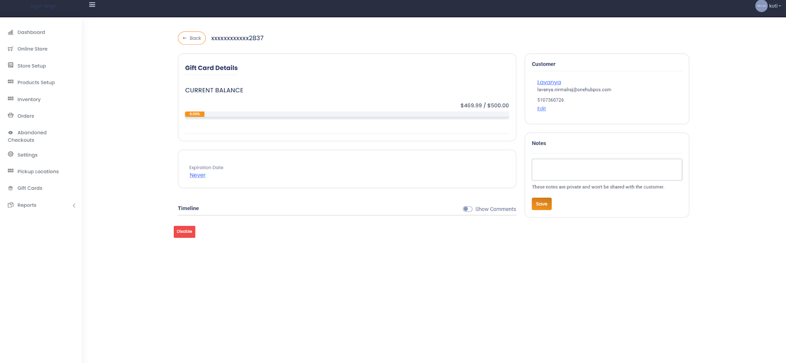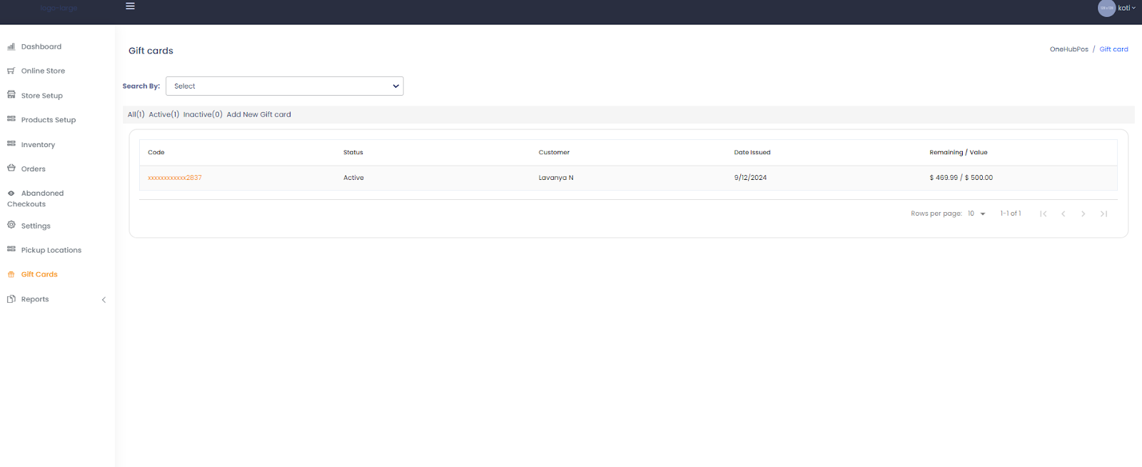 Gift cards are a convenient way to offer customers a prepaid balance they can use for future purchases. The Gift Cards section in OneHubPOS allows you to manage issued cards, check balances, and add new gift cards.